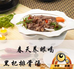 有了眼病,除了要到医院对症治疗外,医生推荐了一款有明目效果的药膳——黑杞排骨汤。其原料是枸杞子20克,黑豆30克,猪骨300克,姜片、葱段、精盐、黄酒各适量。做法是先将枸杞子、黑豆和猪骨洗净后一同下入锅内,加入适量清水,先用大火烧沸,接着加黄酒、精盐、姜片、葱段等调料,再改用小火炖至黑豆烂熟、汤汁粘稠即可。这款药膳里,黑豆能强肝明目,枸杞能调补肝肾,猪骨有滋阴的效果,可有效缓解初春上火导致的人体阴津受损的状态。所以,这款药膳对于从根本上调理眼病有效。