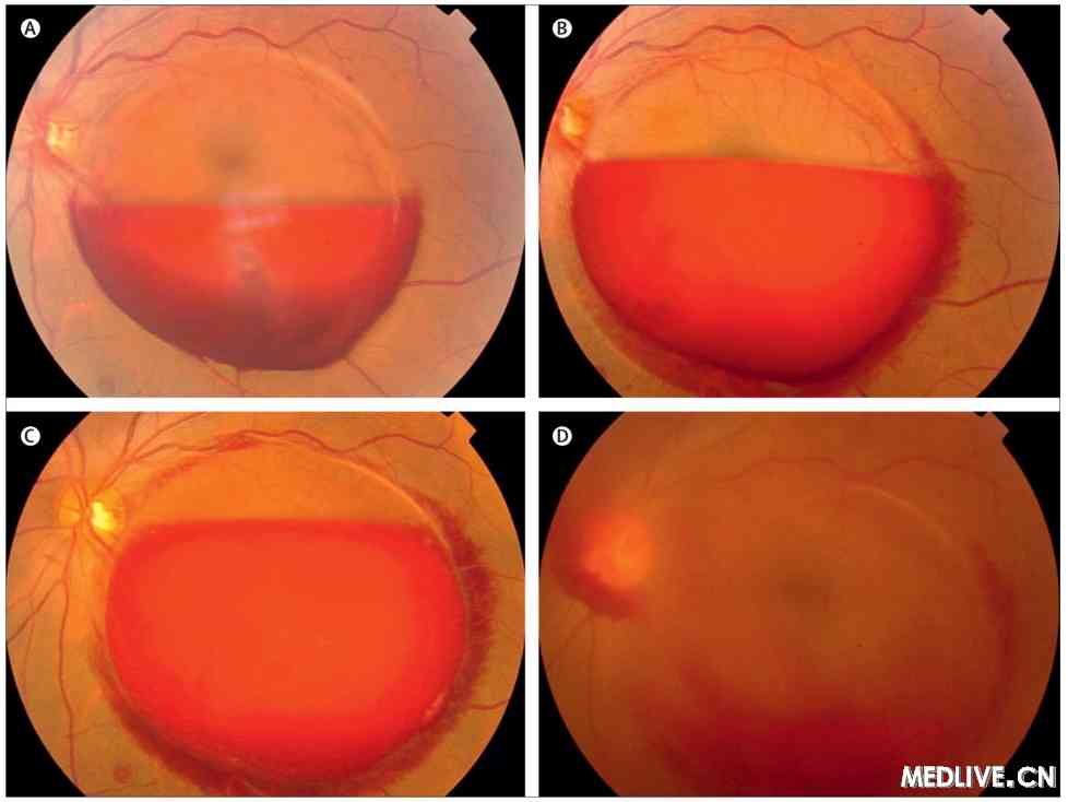 A和B 黄斑前内界膜下出血。C 随访期间血液沉积增加。D 14天后沉积的血液突破内界膜进入玻璃体凝胶。