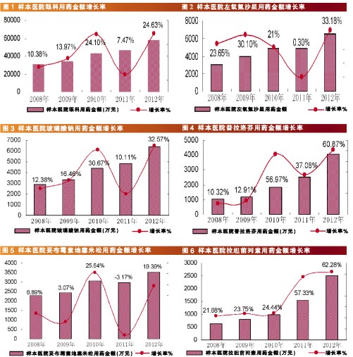 HDM系统数据显示,2012年,国内16个重点城市样本医院左氧氟沙星眼科用药用药金额为6431万元人民币,同比上一年增长33.18%(见图2),居国内眼科药物市场首位。