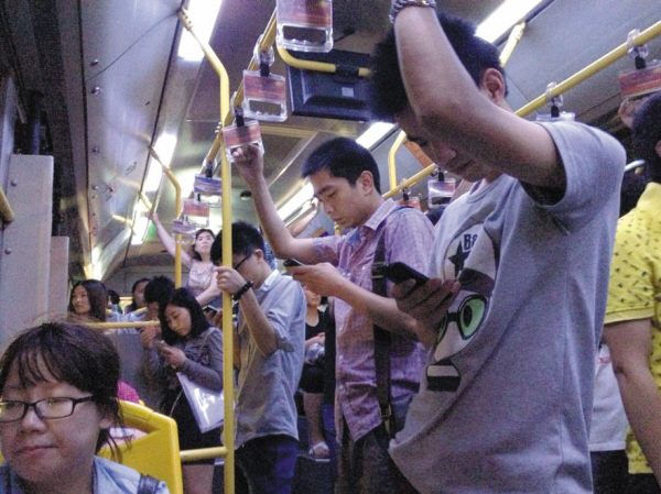 这是我在公交车上无意拍到的一幕:站在中间一排的四个年轻人都保持着同一姿势低头玩手机,这个动作相信不少人都做过。眼科医生提醒过很多次,在晃动的车厢里看手机,比在车厢里看书还要伤眼睛,因为车厢内光线暗,手机屏幕小,光线刺眼,会让视神经过度疲劳,引发各类眼疾。低头族们,要小心眼睛哦!