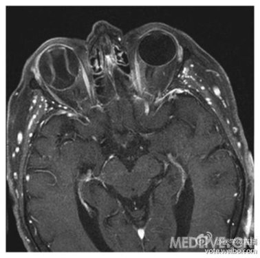 磁共振成像显示右眼可见视网膜剥离,对称隆起异常。