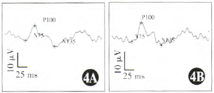 双眼P100波隐含时正常,右眼振幅低于左眼A:右眼P-VEP检查B:左眼P-VEP检查