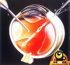 方法:常规睫状体扁平部三切口闭合式玻璃体切割作全玻璃体切除,剥除视网膜前膜,对于视网膜下膜有张力存在而防碍视网膜复位时需手术取出,在视网膜牵拉解除后注入重水压平视网膜同时排除视网膜下液,然后做视网膜裂孔边缘光凝或冷凝封闭裂孔,最后做气-重水交换或硅油-重水交换,关闭切口。对于脉络膜脱离型视网膜脱离患者在做巩膜穿刺口时通过向玻璃体腔注入平衡盐液排除脉络膜上腔积液;对于视网膜张力较大的病例做巩膜环扎;对于下方的裂孔联合巩膜硅垫压或环扎。