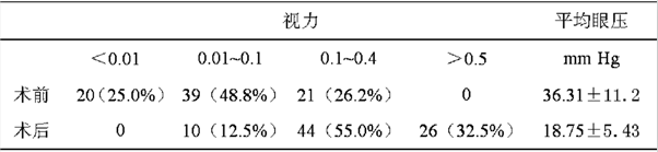 眼压控制在正常范围的有72只眼(90%),8只眼(10%)需要配合使用降眼压药,平均眼压降为(18.75±5.43),相较于治疗前差异显著,(t=12.6185,P<0.01);术后1个月最佳矫正视力≥0.5者26只眼(32.5%);0.1~0.4者44只眼(55.0%);≤0.1者10只眼(12.5%)。术后并发症有角膜水肿13只眼,虹膜损伤2只眼,瞳孔变形7只眼。术前术后详细比较见表1。
