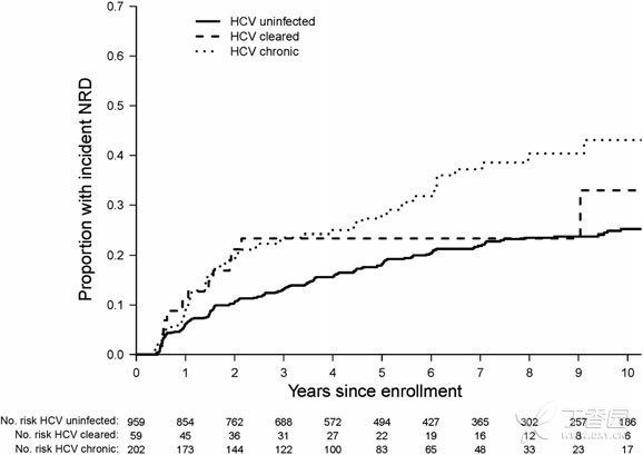 在该研究队列中,有290例患者为慢性HCV感染者,74例为既往HCV感染者,以及1212例未检测到HCV标志物。其中,244名为HIV-NRD现患病例,263名为HIV-NRD新发病例(比率为3.9/100人年)。在经人口统计资料、HIV治疗情况和病毒状况、肝功能以及免疫状态校正的模型中,慢性HCV感染者的HIV-NRD患病率和发病率均显著高于非感染者。慢性HCV还与IL-10R1的rs2228055 SNP及另外两个SNPs相关,这些SNPs被认为可减弱IL-10信号。而HIV-NRD与这些SNPs之间则不存在明显的相关关系。