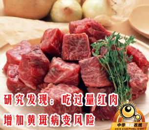 2003年至2006年,研究人员跟踪调查受试者是否出现老年性视网膜黄斑病变。结果发现,1757人出现病变,其中1680人为早期,77人为晚期。研究人员把每人每天正常食用红色肉类的量定为一份,结果发现,与每周吃红肉少于5份的人相比,吃10份红肉甚至更多的人患黄斑病变的风险高47%。