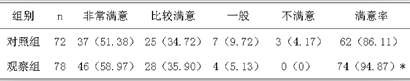 观察组患者护理满意度为94.87%,明显优于对照组86.11%,两组比较差异明显,有统计学意义(P<0.05)。