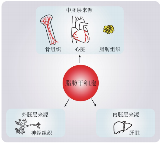 近年来,随着ADSCs诱导分化方面研究的深入,已经证实ADSCs不仅能够分化为中胚层细胞如脂肪细胞、成骨细胞、心肌细胞等,而且可跨胚层分化为外胚层细胞如神经细胞等、内胚层细胞如肝细胞等(图1)。