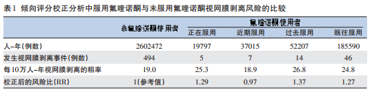 结果显示,共有566例发生视网膜剥离,其中72例使用氟喹诺酮类药物,494 例为非使用者。与非使用者相比,氟喹诺酮类药物的使用与视网膜剥离风险显著增加无关。正在、近期、过去、既往服用氟喹诺酮及未口服氟喹诺酮的患者校正后的风险比见表1。