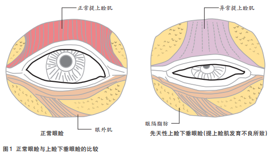先天性单纯性上睑下垂多数是常染色体显性遗传,少数为散发病例,是婴幼儿最常见的上睑下垂原因,因提上睑肌发育不良所致(图1),属肌源性上睑下垂(图2)。横纹肌纤维缺陷程度与上睑下垂严重程度往往成正比。75%患者为单侧受累,大多为特发性。