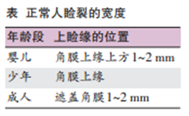 正常人睑裂宽度 睑裂是指在睁眼时上下睑之间的裂隙。成人睑裂长度为20~30 mm,宽度(最宽处)为10~15 mm。睑裂宽度可通过肉眼观察及测量法确定。肉眼观察是用睑缘与角膜缘的相对位置作为指标(表),无论是在婴儿时期、少年时期还是成年后,下睑睑缘均位于角膜的下缘。因此,正常成人角膜与上睑或下睑之间不能看到巩膜。