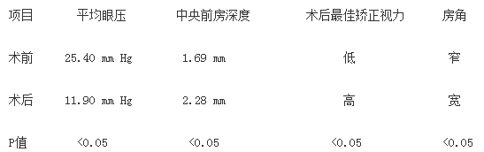 2.3 中央前房深度:术前的平均中央前房深度为1.69 mm,术后的平均中央前房深度为2.28 mm,术前、术后中央前房深度差异有统计学意义(P<0.05)。