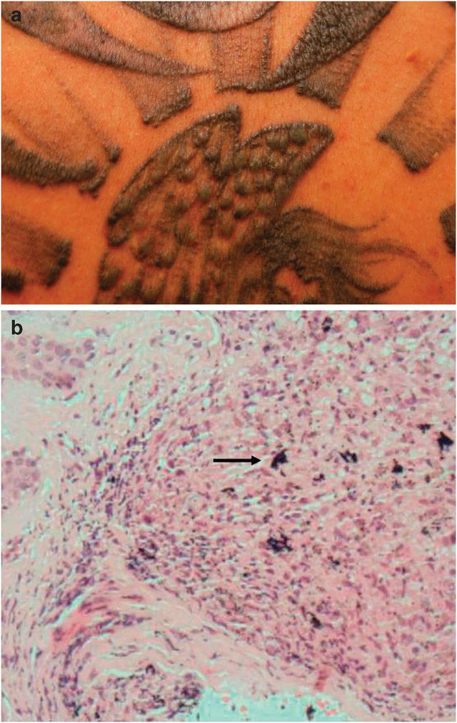 图a为肿胀、隆起的文身;b 为红肿文身皮肤活检组织切片:非干酪坏死样肉芽肿包绕文身色素颗粒(箭头所示),异物肉芽肿与结节病肉芽肿的组织表现非常相似,很难通过肉芽肿的组织学表现除外结节病。