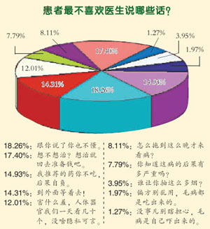 除了调查中我们所列出的那些话,很多患者也反映,有些医生说话特别“噎人”。比如一个患者去年在一家肿瘤医院住院时,听一位即将出院的病人跟主治大夫说:“谢谢您,再见。”结果那个医生却说:“你就别谢我了,过一年你要还能见到我就不错了。”另一个患者因为心脏病犯了,要做导管介入治疗,听说要把很长的管子从大腿根插到心脏里去,心里直打鼓,就问大夫:“这个技术没什么问题吧。”本来是想让医生安慰自己一下,结果对方非但不解释,反过来说:“我们还担心你有问题呢。”这些患者指出,医生说话一定要照顾病人的感受,有时候虽然说的是大实话,但说话的方式却过于伤人。不过,让人欣慰的是,也有相当一部分病人反映,现在医生说话比以前客气多了,太“噎人”的话已经很少听到了。