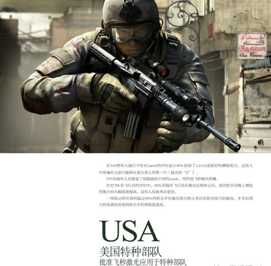 为了解决这些问题,美国国家航空航天局和军方合作,在军队中观察激光治近视的安全性和效果。事实证明患近视的飞行员当中,有89%的人经过飞秒激光治疗 后,在航母上起降的能力有明显提高;超过90%的近视狙击手,在经过飞秒激光治疗后,其射击精准性大幅度提高。这些数据统计显示了飞秒激光的优越性与安全 性,已经达到了军用的标准。