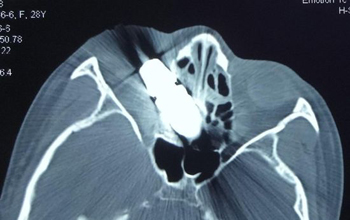 近日,一中心院眼科为一患者成功取出了扎进眼珠的大块金属管。据悉,该患者女,28岁,被高速飞出的金属管扎入眼中,患者受伤后十分着急,赶紧到一中心挂急诊。经检查发现患者右眼眼球壁内侧破裂。CT检查见长约4CM金属管状异物斜上插入眶内,眼球结构破坏,眶内壁骨折,鼻骨中隔穿孔。