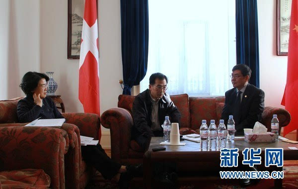 21日,在丹麦首都哥本哈根,中国再生医学集团总裁邵政康(右一)在中国驻丹麦大使馆向科技参赞童威(中)介绍“艾欣瞳”。新华网记者石寿河摄