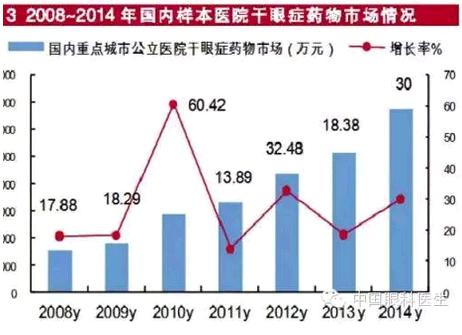 据HDM系统统计数据,2014年,国内重点城市公立医院抗视觉疲劳干眼症滴药剂用药市场规模超过3.35亿元,比上一年增长了30%,高于2011~2014年三年平均增长率。目前,国内重点城市公立医院统计数据中涉及干眼症的化药滴眼剂有15个药物。