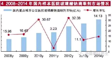 2014年HDM数据表明,国内重点城市公立医院上述五个品种用药市场占据干眼综合征治疗药物市场的94%。其中,玻璃酸钠滴眼剂用药金额2014年同比上一年增长了14.13%,预测2015年国内重点城市公立医院玻璃酸钠滴眼剂将达到2亿元市场规模。在眼科、骨科和美容保健治疗三大终端市场的合力增长下,带动了玻璃酸钠原料药市场的快速增长。由于干眼综合征治疗滴眼剂药物在OTC零售市场具有较大商机,总体市场可达到20亿元的规模,呈现出群雄逐鹿的局面。