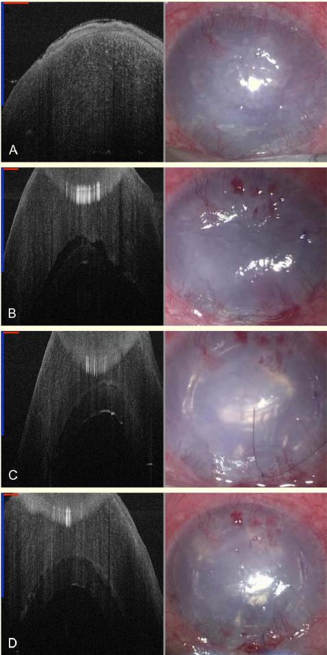 图 1 左为 SD-MIOCT 2D B-scan 图像,右为显微镜下所见角膜;A 为术前严重的角膜水肿;B 显示了角膜内皮移植物与患者角膜的关系;C 为注入填充空气后移植物与角膜基质贴附;D 为完成移植手术后的角膜(图中用红、蓝线段长度表示 1 mm)