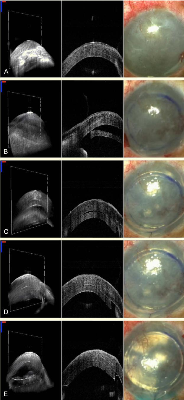 图 2 为 3D SS-MIOCT 集成显微镜系统手术过程;A 为术前;B 为内皮层植入时;C 为填充空气后;D 显示移植内皮层与受体基质层界面间的液体减少;E 移植物与受体贴合良好(图中用红、蓝线段长度表示 1 mm)