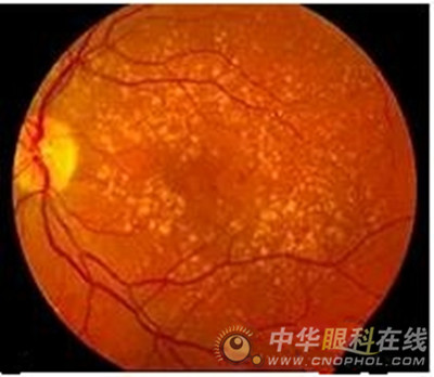 视网膜黄斑病变的一个显着病理特征是分布在视网膜上的黄色沉积物(Drusen),是蛋白质与脂的混合物,但其来源不详,可能是炎性产物,其病理作用是破坏视网膜色素上皮细胞(RPE)。见下图。
