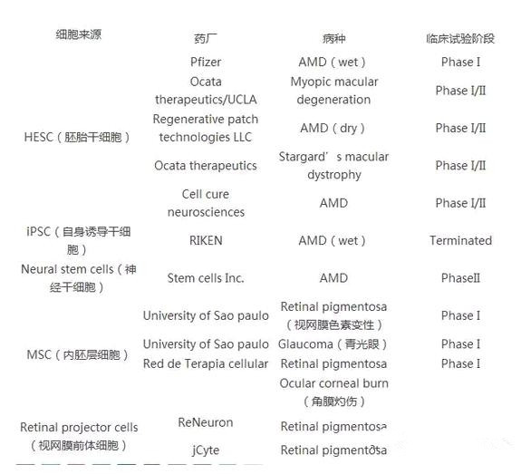 再生医学不仅致力于老年性退化性黄斑病变(AMD),同样还可以用于治疗另一个致盲病因Retinal pigmentosa(视网膜色素变性)。同样损伤视网膜色素上皮细胞(RPE),不过视网膜色素变性损伤的是周边视野的还有其它眼病如青光眼,角膜灼伤等。为了给大家一个再生医学治疗眼科疾病大的图片,笔者总结了目前一些公司进入临床试验的概况。衷心期待这些公司能在再生医学上取得成功,为广大眼科疾病患者带来福音。