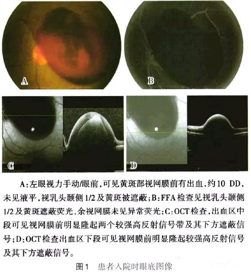 体检:一般情况好,心肺腹无异常,血压110/60 mmHg。眼科专科情况:右眼视力1.0,眼压15 mmHg,眼前节正常,视乳头边界清,视网膜平坦,视网膜血管动静脉管径比为2/3,黄斑无水肿、反光存在;左眼视力:手动/眼前,眼压14 mmHg,角膜透明,前房轴深3 CT,房水闪光(-),虹膜纹理清,瞳孔3 mm,对光反应灵敏,晶状体、玻璃体透明,视乳头颞半侧及黄斑区面积约10个视乳头直径(DD)大小圆顶状隆起的视网膜前出血,出血灶无液平面,出血多的颜色较深,见图1-A。