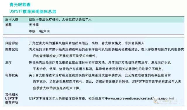 USPSTF认为,现有证据还不足以对成年人原发性开角型青光眼筛查的利弊进行有效评估。(I级声明)。