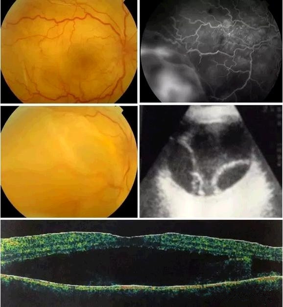 图 2 左上为病例 5 就诊时交感眼的眼底彩照,可见视盘充血水肿;右上为眼底造影,可见后极部针尖样高荧光、颞下象限局限渗出性视网膜脱离;左中为治疗 10 天后眼底相,大范围渗出性视网膜脱离,无明显改善;右中为对应 B 超;下图为相应光相干断层扫描示视网膜脱离。(此患者失访)