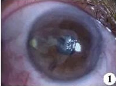 査体:视力:右眼0.02,左眼1.0;眼压:右眼12 mm Hg,左眼16 mm Hg;右眼结膜轻度充血,角膜中央及颞侧可见片状增生组织,厚薄不一,边界清晰,病灶隆起,病灶位于角膜浅层,病灶与角膜缘之间有透明组织相隔,病灶覆盖瞳孔区,前房、晶体未见明显异常,余窥视不清(图1)。