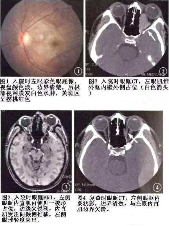 眼眶CT检查显示,左眼肌锥外眶内壁外侧占位(图2)。