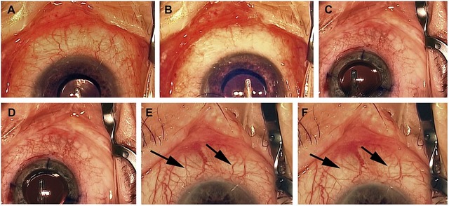 图 1 为白内障超声乳化联合小梁消融术中,EVFW 不同波动程度及时间。A 为鼻侧巩膜上血管,Schlemm's 管打开,但未见 BSS 流入前房; B 为 BSS 冲洗巩膜上静脉,EVFW 波动程度为 4; C、D 为无液体流经小梁网途径,波动程度及时间均为 0; E、F 为低波动程度及时间, E 鼻侧巩膜上血管无 BSS 流过, F BSS 流入前房,2 条血管 EVFW 波动程度为 3,而时间仅为 1 小时