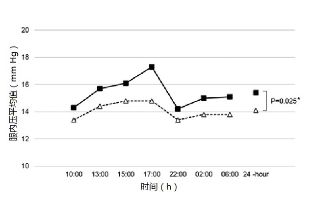图 1 为透析日(实线)及非透析日(虚线)24 小时眼内压平均值曲线