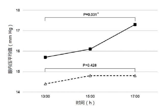 图 2 为透析日(实线)及非透析日(虚线)13:00,15:00,17:00 眼内压平均值曲线