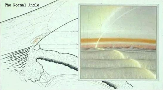 房角示意图:正常房角---可见全部房角结构,1示Schlemm氏管,2 示睫状体带,5示Schwalbe线,6示小梁,8示虹膜根部,