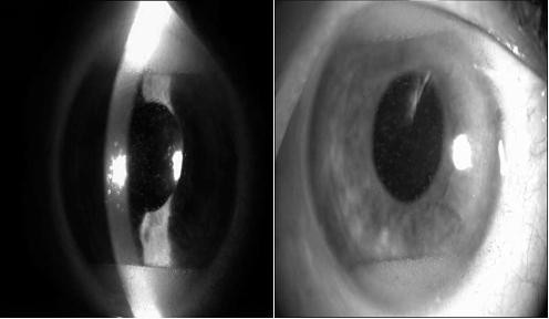图 1 为裂隙灯下观察到的前房上方和下方「假性积脓」