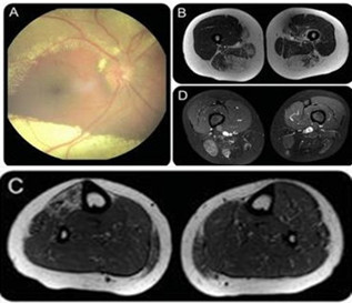 图(A)眼底镜检查显示视网膜萎缩,视网膜周围大量渗出。肌肉 MRI 轴位像显示大腿后部肌肉和右侧胫前肌肉被脂肪组织所替代。B、C 为 T1 像,D、E 为 T2 压脂像