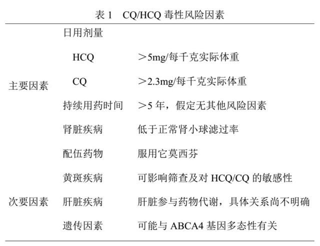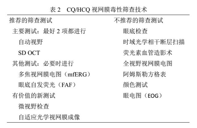 美国眼科协会于 2016 年发布修订版氯喹(CQ)/ 羟化氯喹(HCQ)视网膜毒性筛查指南,针对 CQ/HCQ 视网膜毒性、毒性统计风险及推荐剂量、毒性风险因素及筛查等方面提出详细指导。