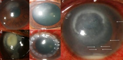 (图 1) 图 1 发病初期(a)角膜上皮完整,基质水肿;(b)3 天后,角膜浸润;(c)角膜上皮出现缺损,环状浸润,放射状角膜神经炎(白色箭头),角膜基质水肿;(d)角膜全层致密浸润;(e)角膜移植术后,无感染及复发倾向