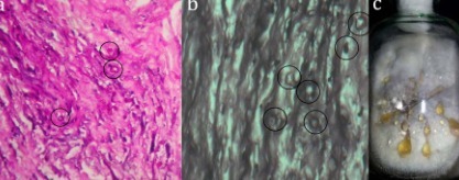 (图 2) 图 2 切除的角膜组织行病理检查及微生物学检查(a)HE 染色(b)甲胺银染色,基质中显示短的真菌丝(c)真菌生长环境,葡萄糖琼脂