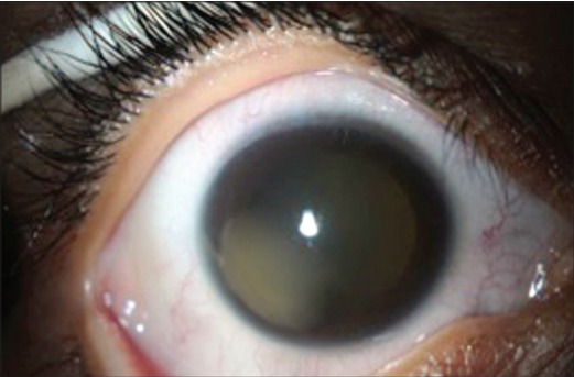 图 1 显示患者颞下方角膜血染及白内障早期