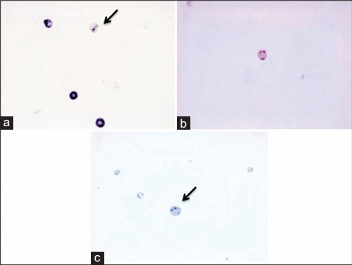 图 2a 为房水样品细胞学涂片显示红细胞,黑色箭头示血影细胞;b 为血影细胞常规染色;c 显示血影细胞典型特征海因茨小体