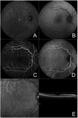 2 周后,左眼视力及眼底检查无明显变化(图 2)。FA 和 吲哚青绿血管造影(ICGA)仍显示微血管结构异常、渗漏及荧光遮蔽,ICGA 显示黄斑区脉络膜荧光异常(图 3)。SD-OCT 示视网膜内及视网膜下渗出,中心凹下少量网膜下液(图 4)。全身各项检查(血常规、C 反应蛋白、血沉、补体、自身抗体、感染指标等)均未见明显异常。