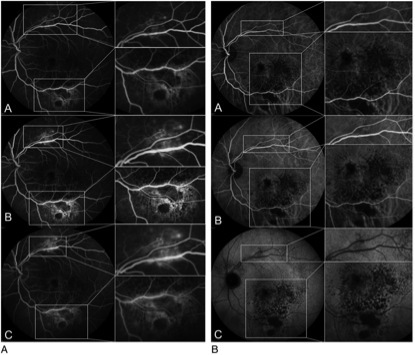 图 3 A 左眼 FA 示早(A)、中(B)、晚(C)期颞侧血管弓视网膜毛细血管渗漏,黄斑区及颞下血管弓荧光遮蔽;B 左眼 ICGA 示早(A)、中(B)、晚(C)期沿颞侧血管弓分布的微血管结构异常,黄斑区可见脉络膜改变