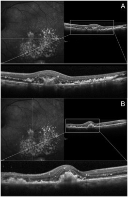 图 4 左眼 SD-OCT 水平(A)及垂直(B)径线扫描,可见黄斑区视网膜内及下方大量高反射渗出及 PED