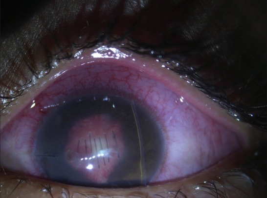 术后第 1 天,患者无光感,缝合末端角膜浸润厚(图 1),晶状体膨出,使前房变浅。超声检查显示玻璃体腔充满浸润物,提示为眼内炎。患者静脉注射环丙沙星,局部使用 0.5% 莫西沙星,1% 阿托品,0.1% 倍他米松及 0.5% 羧甲基纤维素。因预后不良,未实行玻璃体切除术。