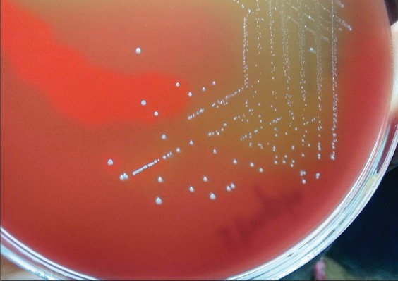 图 2 为在羊血琼脂上,培养物显示α溶血