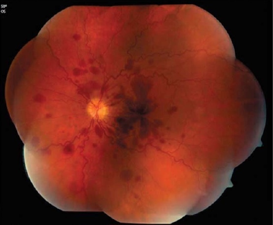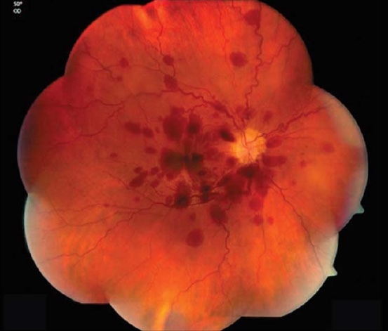 图 1 和 2. 眼底检查提示左眼(图 1)和右眼(图 2)视网膜和视网膜下以及玻璃体存在片状出血。
