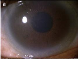 35 岁男性,因「下肢浮肿」入院。体格检查提示角膜弧状云和角膜混浊(图 1),双下肢凹陷性浮肿。患者提到他的兄弟姐妹与他有相似的症状,如眼睛朦胧感和肾脏疾病,但是他们拒绝就医。